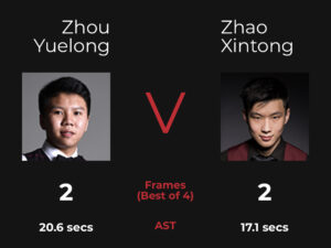 在决赛日的小组赛上,赵心童和周跃龙分在同一组,与特鲁姆普和塞尔比同组。小组赛中,两位小将虽均不敌特鲁姆普,但都战胜了塞尔比。在最后一轮两人的直接交锋中,周跃龙与赵心童最终战成2-2平。