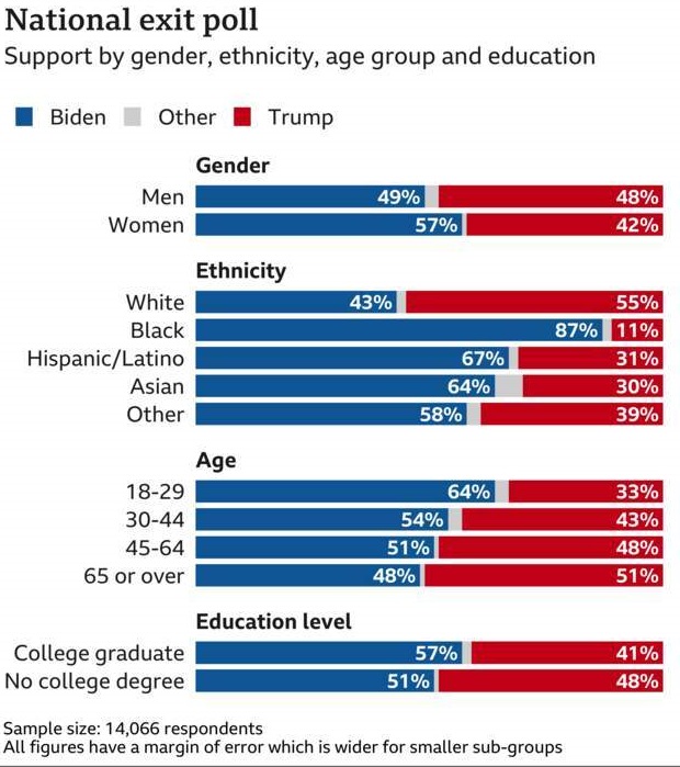 2020年美国大选投票率之高空前。投票站开始陆续关闭。票站民意调查显示,左右选民投票决定的最主要议题是经济。