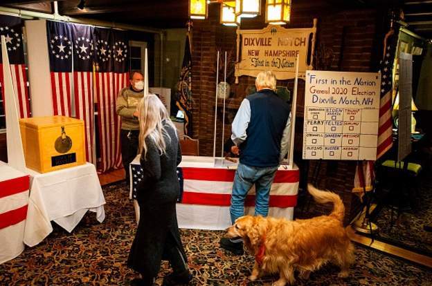 迪克斯维尔山口(Dixville Notch)是新罕布什尔州的一个仅有12人的村庄,当地居民在周二(11月3日)午夜钟声敲响后开始投票。选民们一致支持民主党候选人拜登,这只狗也来到了投票现场。