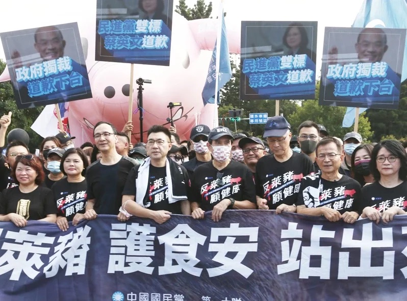 現任國民黨主席江啟臣,前任主席馬英九,吳敦義,朱立倫以及藍營多名縣市長和國民黨籍立委議員,週日中午也現身遊行隊伍,和民眾一起齊聚自由廣場。江啟臣當場在台上叫陣蔡英文總統,出來辯論萊豬進口。他說,「距離瘦肉精美豬大舉侵台只剩下39天,但蔡政府根本還沒準備好,不跟人民溝通,也不跟人民說明。國民黨拚命擋,要求要有配套,但是行政院連食安會報都不開。」江啟臣向民眾喊話說,「看到政府這樣你們會甘心嗎?憑什麼叫人民吃萊克多巴胺?台灣的豬都不用吃,台灣的人卻要吃,大陸人都不吃,台灣人卻要吃,只憑蔡英文鴨霸,只憑他們有817萬票,但是人民可以讓你當總統,也可以讓你下台。」前總統馬英九也痛批民進黨不顧六成民意反對進口萊豬,已經變成一黨專政,一黨獨裁。他同時呼籲蔡英文重啟談判,歡迎美豬,但是反對萊豬。