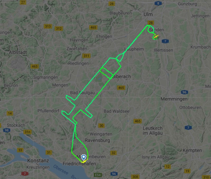 德國20歲飛行員克雷默(Samy Kramer)飛了200公里,在天上製造一個針筒形狀的飛行路徑,提醒民眾歐洲已開始疫苗接種行動。