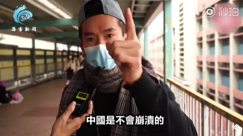近日,有“港独”分子公然炮制“中国崩溃论”、“深圳崩溃论”。对此,有香港青年25日接受港媒采访时慷慨陈词,有理有据一一驳斥这些阴谋论。他一针见血指出这些人坐井观天,是井底之蛙,是汉奸的基因,他表示:“我可以好肯定说给你们听,中国是不会崩溃的!”