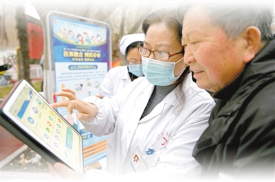 2020年12月2日,安徽理工大学第一附属医院医护人员走进淮南市田家庵区洞山社区,指导老年患者使用皖事通平台淮南分站上线的该院互联网医院应用服务,方便老年患者使用手机就医问诊。 陈 彬摄(影像中国)