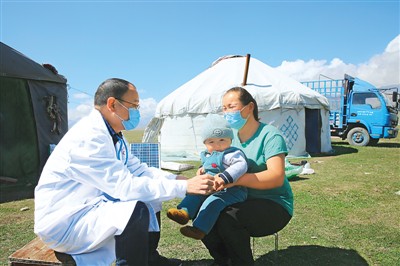2020年8月30日,湖北省十堰市中医院的专家团队,来到新疆博尔塔拉蒙古自治州西南部的海西牧场,为牧民群众开展义诊。 吕现领摄(人民视觉)