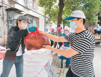 武汉市东西湖区长青街三民小区居民(右)在购买团购菜。  新华社记者 肖艺九摄