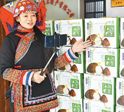 1月12日,湖南永州千家峒瑶族乡小古源村,村民赵进玉正在网络直播销售香芋。  田如瑞摄(人民视觉)