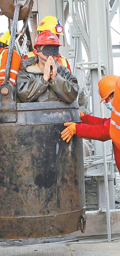 生命通道陡然之间打通!井下“四中段”发现一名身体极其虚弱的矿工,加上“五中段”已经联系上的10名矿工,按照伤势先重后轻的顺序,他们分5批先后乘坐吊笼,成功升井。