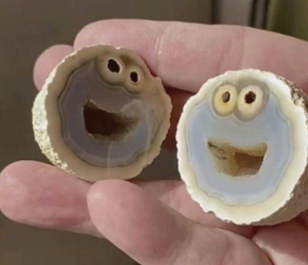 这个可爱的小石头看起来更像是一个鸡蛋被分成了两半,不可思议的是,它的每一半都拥有一副完整的“饼干怪兽脸”。