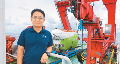 海试期间,赵洋在万米级载人潜水器“奋斗者”号前留影。 中科院沈阳自动化研究所供图