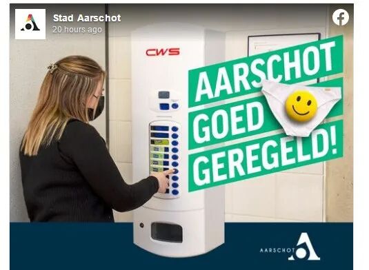 佛兰芒布拉班特省的Aarschot市也在其所有中学的女厕所里安装了提供免费卫生巾的机器,不久后,在所有市政建筑物和公共厕所里,我们也能看到它们的身影。