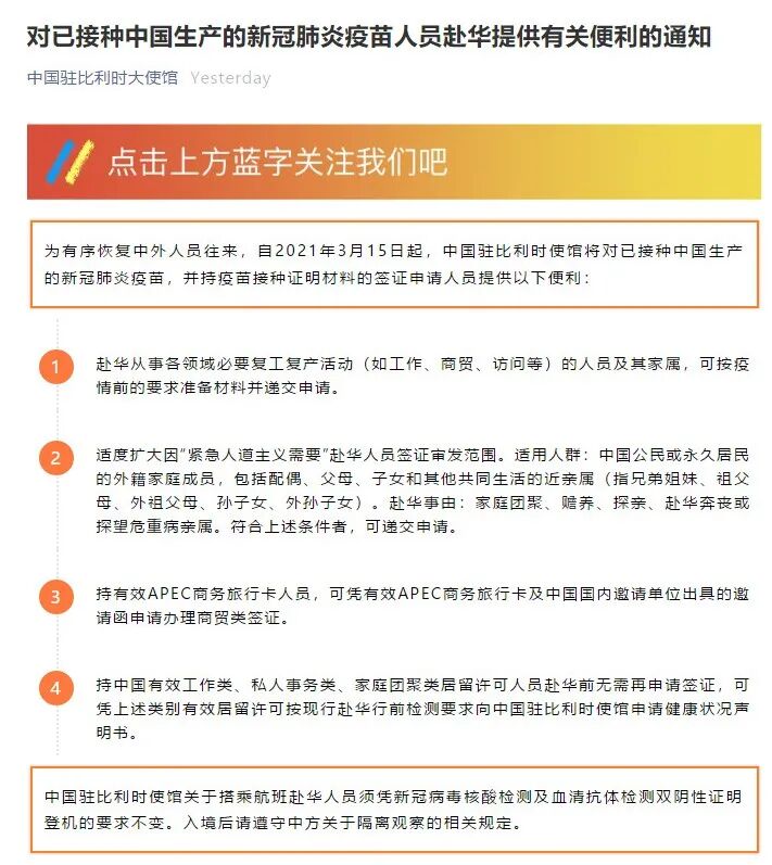 3月15日,中国驻比利时使馆发出通知:为有序恢复中外人员往来,自2021年3月15日起,中国驻比利时使馆将对已接种中国生产的新冠肺炎疫苗,并持疫苗接种证明材料的签证申请人员提供便利。