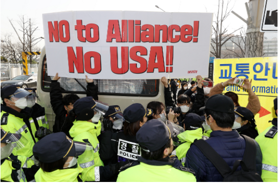 集会民众打出横幅,并高呼“拒绝加入美日韩三角联盟!”“不要萨德”“拒绝加入日美澳印四国联盟!”“废除保护费”“谴责韩美外长会谈”等口号,现场还有人打出海报,上面画有美国国务卿布林肯的头像,其嘴部被打上了鲜红色的叉号。在此之前,韩美签署《防卫费分担特别协定》。首次规定韩国今后每年的“保护费”金额,将与当年国防费支出挂钩,并取消了增幅上限。这一规定将最终导致韩国每年“保护费”金额不断增加,势必加重韩国政府负担,引发韩国社会广泛担忧。(来源:海外网)