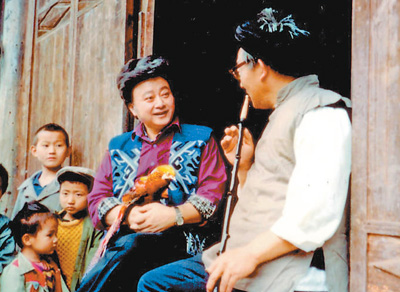 胡松华(右二)与湘西土家族老乡谈论乐器的吹法。 资料照片
