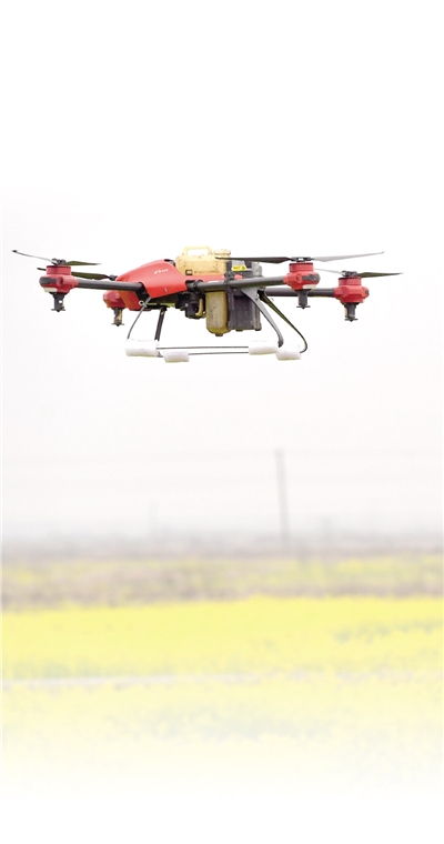 近日,在江西南昌县大田农社智慧农场,无人机在油菜田里喷农药。李 轩摄(人民视觉)
