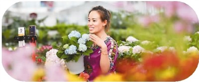 在河南省许昌市鄢陵县建业绿色基地,一名工作人员通过直播的形式向消费者介绍花卉品种。牛书培摄(人民图片)