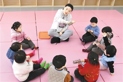 日前,江苏省连云港市设立的首批11家普惠托育试点陆续开始运营,切实减轻家庭抚育0到3岁子女的负担。图为连云港市海州区新海街道小红花托育中心的小朋友在老师指导下做游戏。耿玉和摄(人民视觉)