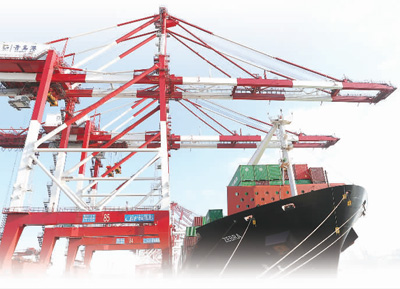 1月19日,在中国(山东)自贸试验区,一艘货轮在青岛港前湾集装箱码头装卸货物。张进刚摄(影像中国)