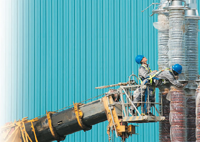 在张北柔直换流站阀厅内,施工人员正在安装阀塔的模块。  邹 明摄