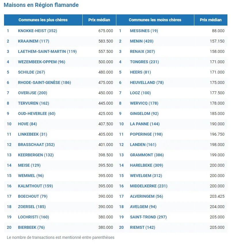 Flemish Brabant 和Walloon Brabant是房价最高的省份,Limburg和Hainaut房价最低。Knokke-Heist(西弗兰德)是房价最高的市镇;而在Namur省的Hastière 可以找到最便宜的房子。
