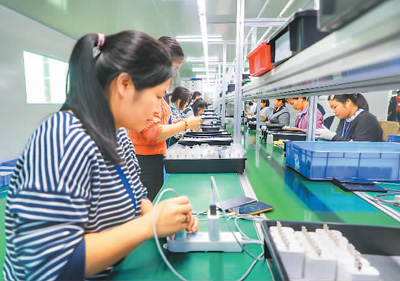 今年一季度,江西省赣州市全南县规上工业企业完成工业产值14.78亿元,同比增长42.7%,实现“开门红”。图为工人在全南县江西络鑫科技有限公司生产车间赶制订单。尹其奇摄(人民视觉)