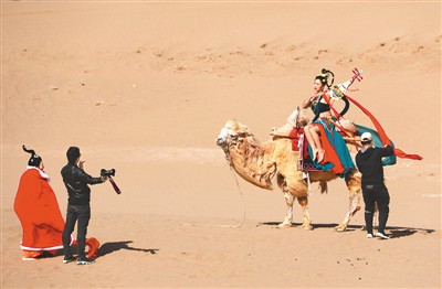 游客在甘肃敦煌鸣沙山月牙泉景区拍照。张晓亮摄(人民视觉)