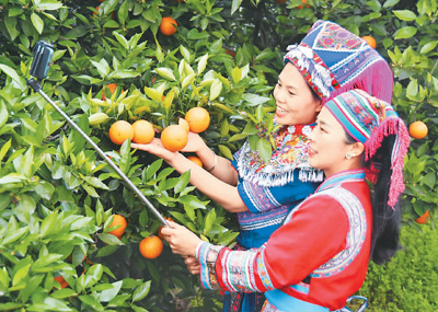 湖南省永州市江永县3.6万亩夏橙近日迎来丰收季,不少种植户利用电商平台,通过网络直播带货,拓宽农产品销售渠道。4月29日,村民在直播销售夏橙。田如瑞摄(人民视觉)