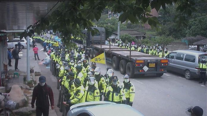 据韩联社报道,当天凌晨5点40分左右,反对“萨德”的公民团体和当地居民来到基地入口,堵路示威。但警方随后强行驱离了示威人群,为运输车辆开道。最终,装载建材和施工人员的18辆运输车进入基地。