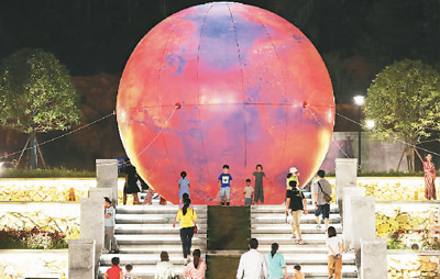 5月15日,“祝融号”火星体验馆在湖南衡阳南岳区开馆,体验馆展出了中国首辆火星车“祝融号”模型,通过“祝融号”发展历程科普、沉浸式火星场景体验、宇航服穿戴体验等形式,向游客普及“祝融号”相关知识。图为“祝融号”火星体验馆外的红色“火星球”吸引游客拍照打卡。  罗茂盟摄(人民图片)