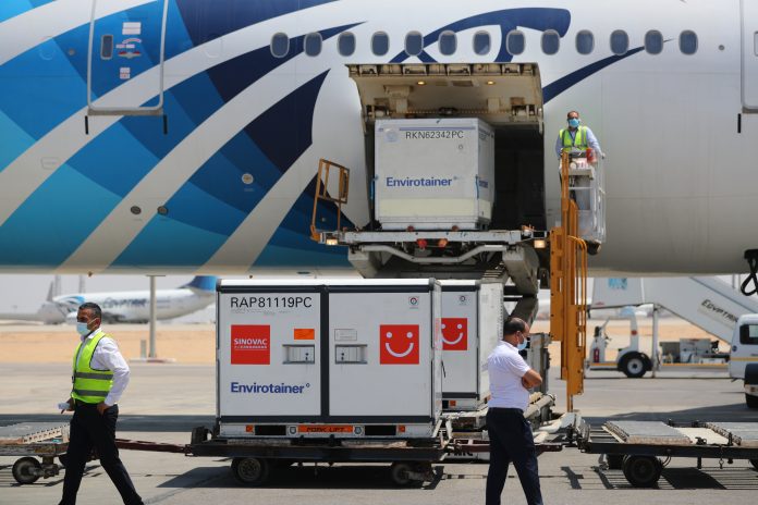 科兴疫苗原液运抵开罗 摄影:新华社开罗分社 隋先凯