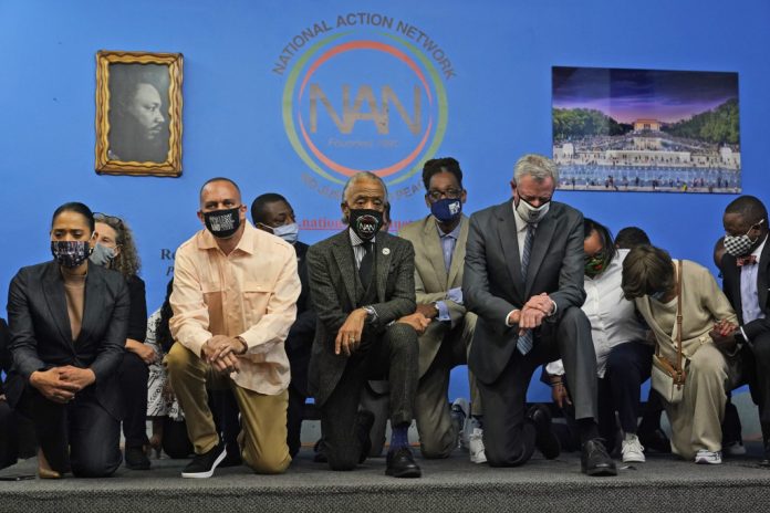 纽约市长下跪纪念弗洛伊德(左起第4位)