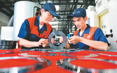 安徽省马鞍山市博望区技锋精密刀具有限公司自主研发出双晶颗粒新材料等精密刀片,产品畅销国内外市场。图为工人在检验精密刀片质量。