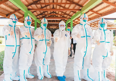 2021年5月10日,中国抗疫专家组在老挝北部乌多姆赛省准备进入新冠确诊患者隔离病房。
