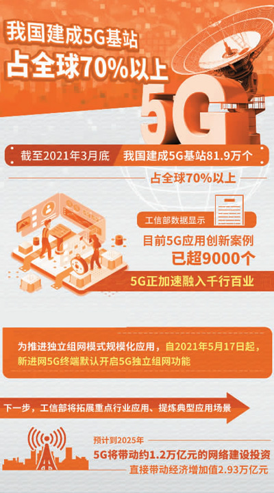 工信部数据显示,中国已累计建成5G基站超81.9万个,覆盖全国所有地级以上城市,建成全球规模最大的5G独立组网网络。中国信息通信研究院预计,到2025年,5G将带动1.2万亿元左右的网络建设投资,拉动8万亿元相关的信息消费,直接带动经济增加值2.93万亿元。