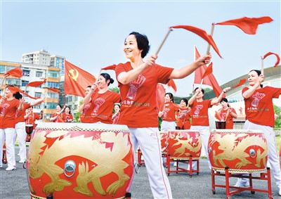 6月8日,湖南省邵阳市洞口县高沙镇手鼓协会举行“一颗红心永向党”活动,庆祝中国共产党百年华诞。 滕治中摄(人民视觉)