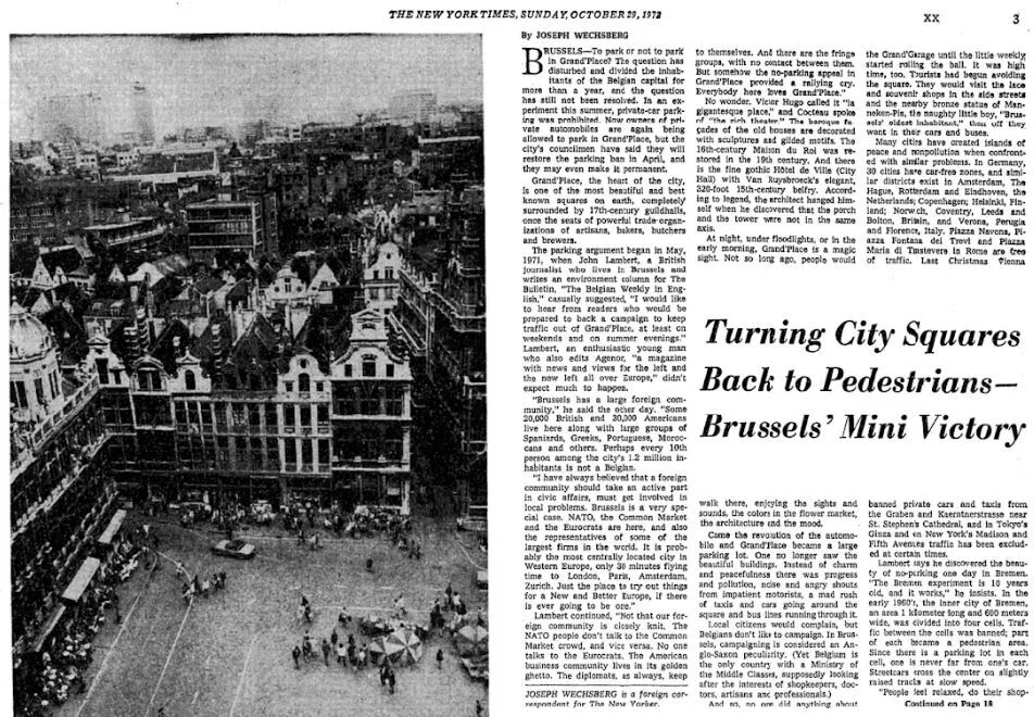 Lambert的这篇文章得到了非常积极的回应。因此,《公报》也加入进来,发起了一场让大广场步行化的运动,并发起了一份请愿书,要求将大广场从所有交通运行中解放出来。他们称大广场是“世界上最美丽的停车场”,并抱怨汽车排放的尾气“损害人们的健康,破坏了历史建筑。”