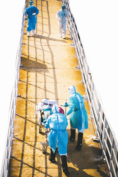 图为二〇二〇年二月四日,医护人员走向武汉火神山医院病房。  新华社记者  肖艺九摄