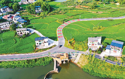 重庆市梁平区在渔米路沿线发展水稻、渔业、杨梅、养殖等特色产业,完善基础设施,助力乡村振兴。图为在梁平区礼让镇同河村,梁平渔米路与稻田、河流、农房等构成美丽的田园画卷。 刘 辉摄(人民视觉)