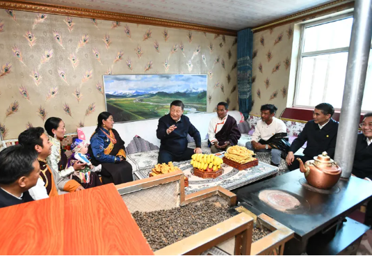 2021年6月7日至9日,习近平在青海考察。这是8日下午,习近平在海北藏族自治州刚察县沙柳河镇果洛藏贡麻村,同藏族牧民索南才让一家人围坐在客厅聊家常。新华社记者 谢环驰 摄
