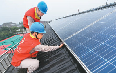 在浙江省德清县新安镇舍西村,工作人员在检查村民屋顶太阳能光伏板并网发电情况。