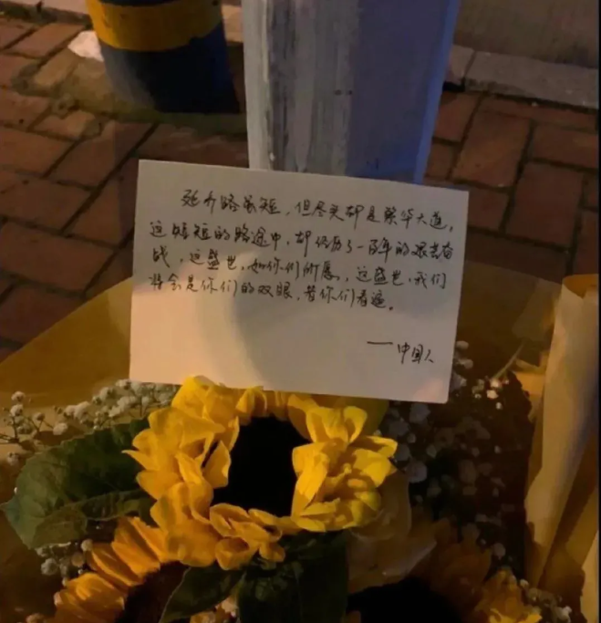安徽合肥,延乔路路牌下,一束鲜花夹着这样一张卡片。落款是三个字:“中国人”。