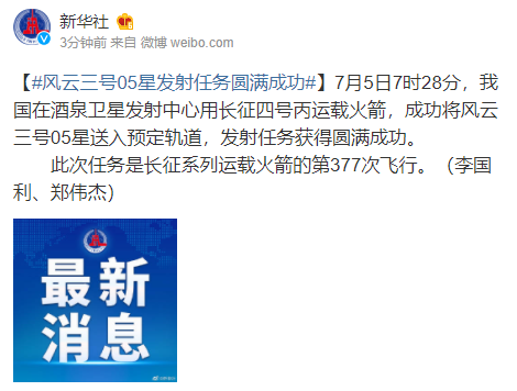 海聚推荐 风云三号05星发射任务圆满成功 5 7 月, 2021 7月5日7时28分,我国在酒泉卫星发射中心用长征四号丙运载火箭,成功将风云三号05星送入预定轨道,发射任务获得圆满成功。 此次任务是长征系列运载火箭的第377次飞行。(李国利、郑伟杰 摄影/汪江波)