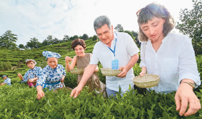 6月25日,浙江省金华市磐安县玉山古茶场,来自南非、俄罗斯、意大利、乌克兰等18个国家的国际友人在体验手工采茶。胡肖飞摄(人民视觉)