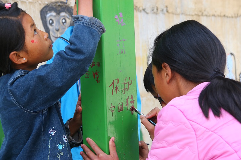 社区保护宣传活动中,孩子们写下“保护中国猿”的字样。廖志荣 摄