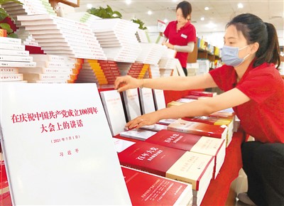 7月13日,安徽省六安市城区新华书店工作人员在整理新上架的图书。人民出版社出版的习近平《在庆祝中国共产党成立100周年大会上的讲话》单行本成为近期热销图书。田凯平摄