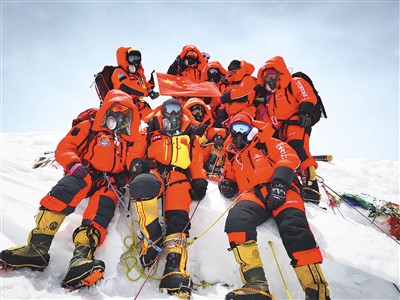 2020年5月27日,2020珠峰高程测量登山队在峰顶合影留念。  扎西次仁摄