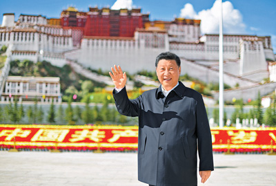 7月21日至23日,中共中央总书记、国家主席、中央军委主席习近平来到西藏,祝贺西藏和平解放70周年,看望慰问西藏各族干部群众。这是22日下午,习近平在布达拉宫广场考察时,向游客和当地群众挥手致意。新华社记者 谢环驰摄