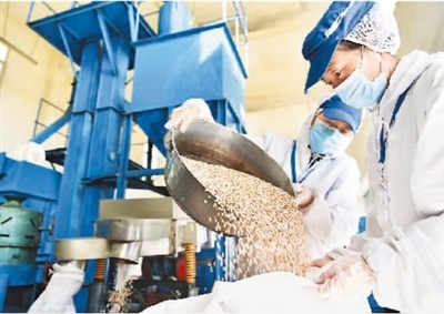 西藏自治区洛隆县洛宗特色产品开发公司生产的青稞特色产品在拓宽销路的同时,为当地群众增加就业岗位。目前,该公司提供45个就业岗位,与洛隆县1000余户青稞种植户签订了青稞收购合同。图为公司员工将烘炒好的青稞装袋。
