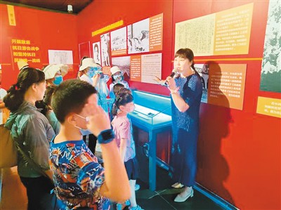 主题展现场,一名小观众在听讲解员讲述革命故事时,情不自禁地敬礼。