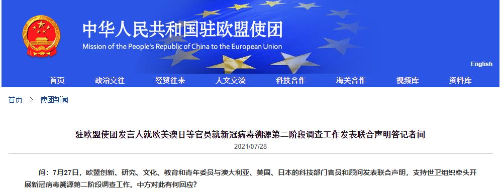 海外网7月28日电 据中国驻欧盟使团网站消息,驻欧盟使团发言人就欧美澳日等官员就新冠病毒溯源第二阶段调查工作发表联合声明答记者问,内容如下。