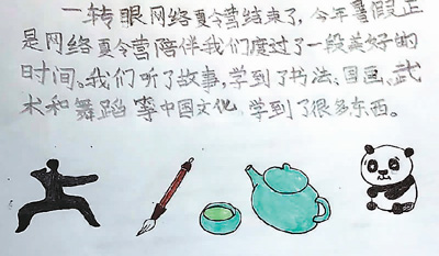 就读于西班牙爱华中文学校的阮萧天很喜欢武术和中国画,而此次活动的课程正好包括武术课、国画课。“学得很开心。除了这两门课,我还很喜欢文化课和手工课。剪纸有些难,但看到自己剪出来的作品,很有成就感。在这10天中,我学到了很多,比如中国历史知识、汉字的来源等,更加激发了我进一步了解中华文化的热情。”